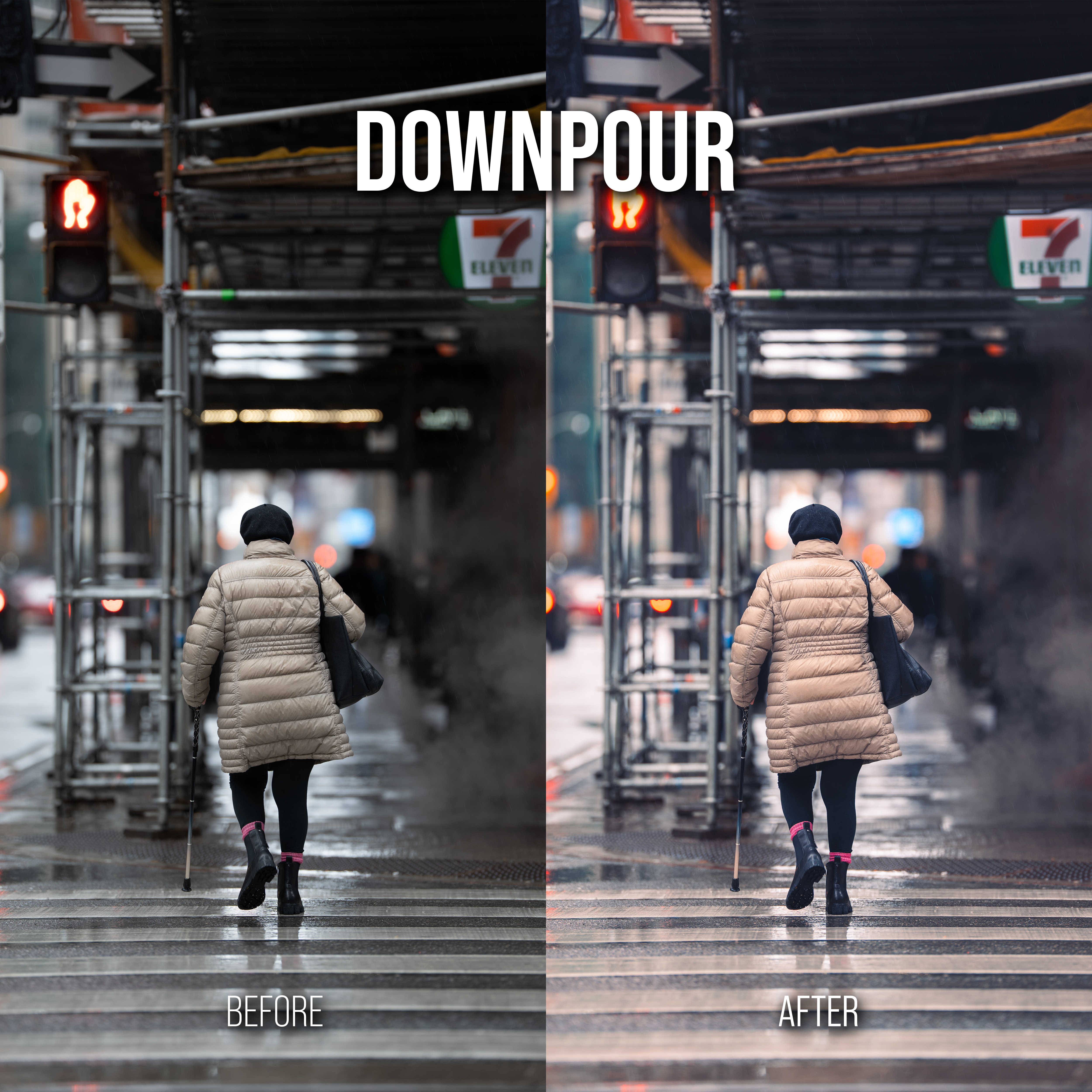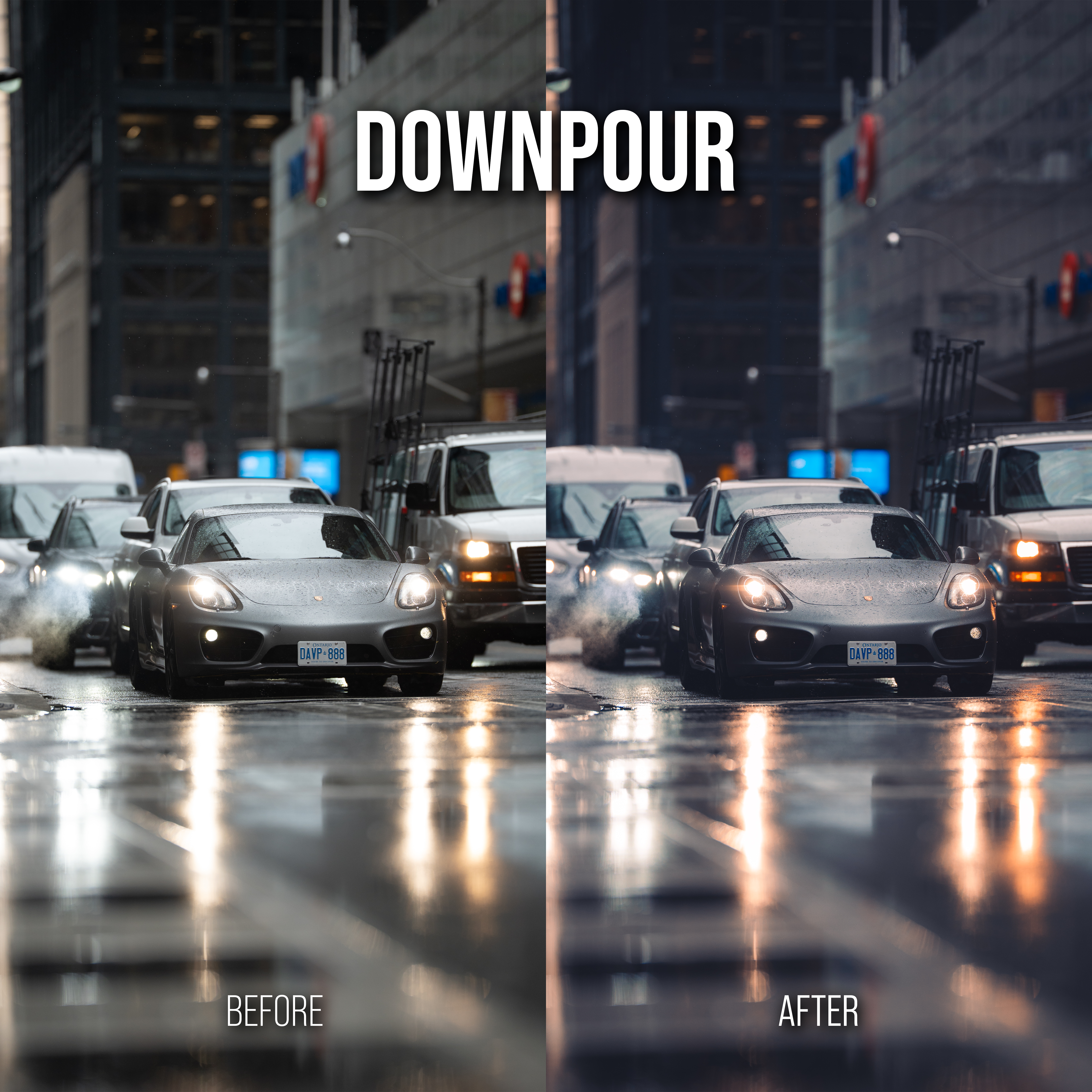 - DOWNPOUR – Moody rain-soaked grading with deep shadows and cinematic greys