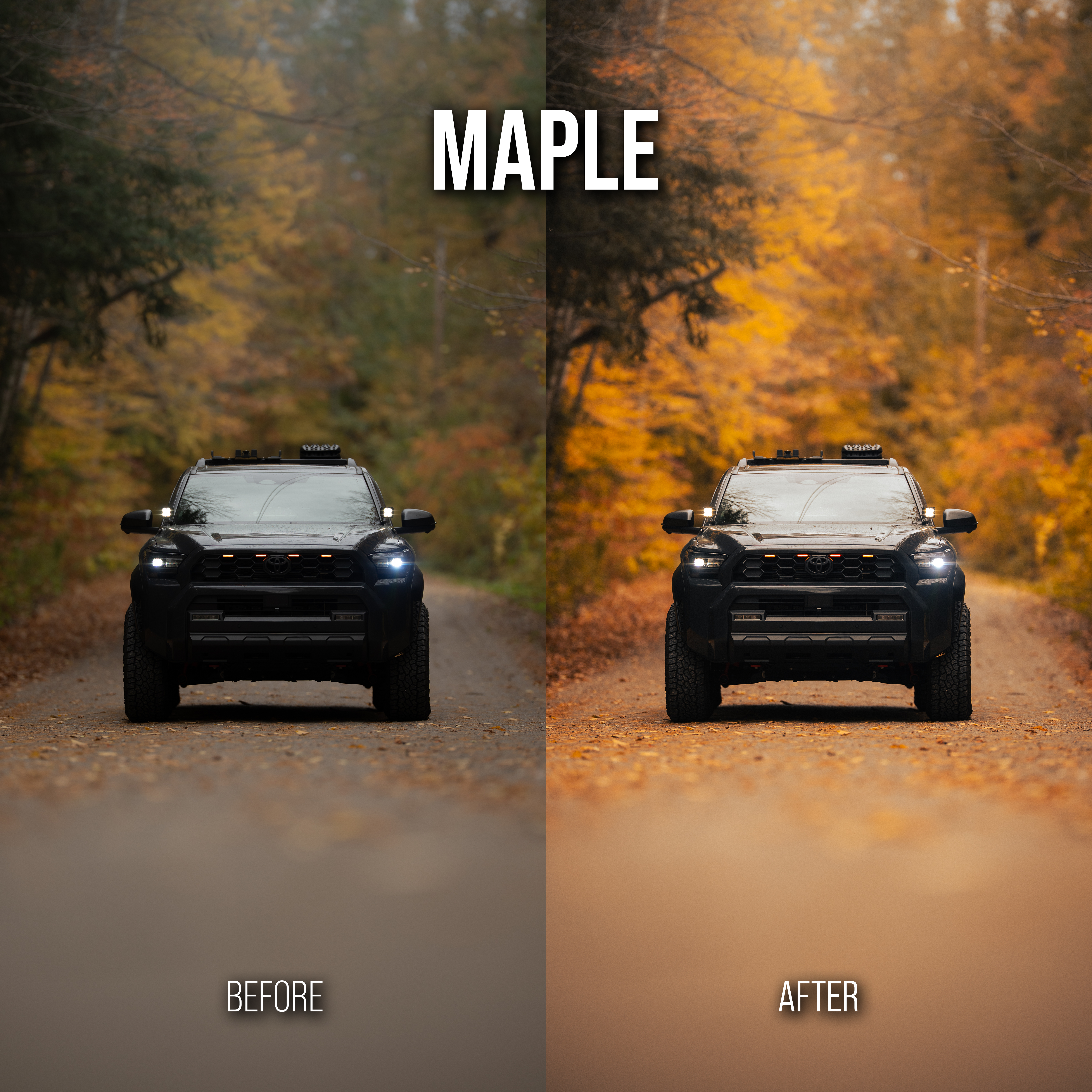 - MAPLE – Warm autumn hues with rich oranges and a classic fall film look